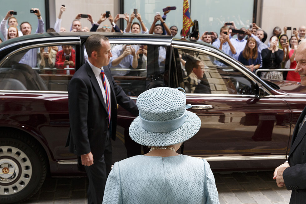 Un employé en costume noir et cravate ouvre la portière pour que la reine prenne place sur la banquette arrière du véhicule.